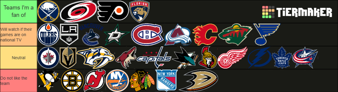 Below is a tier maker on how I feel about the other twenty-eight teams not named the Panthers, Flyers, Sabres, and Hurricanes.